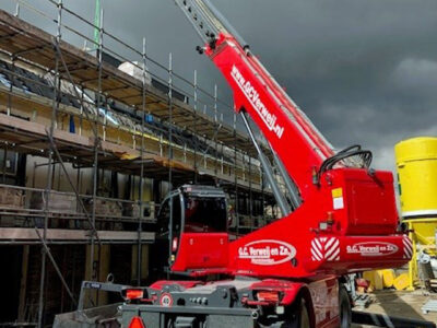shovels met kraanarmen met haakhoogte tot 28 meter, roterende verreikers tot 46 meter hoogte, verhuur midi kraan en zwenklader.